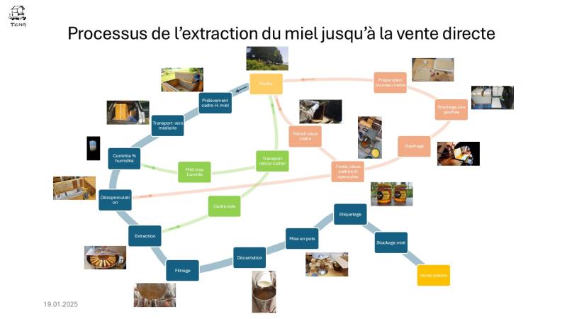 Votre explicatif (processus) de l’extraction du miel jusqu’à la mise en bocaux, schéma explicatif avec les étapes.