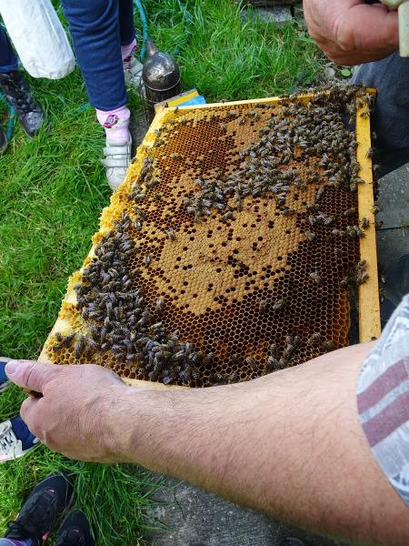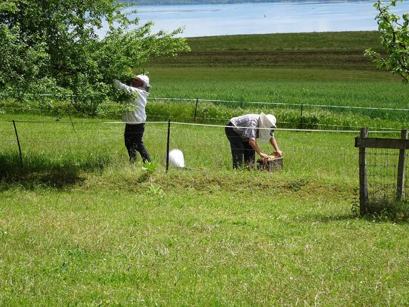 Tout d’abord, ils ont pu observer la cueillette d’un essaim puis la visite du rucher et les cadres avec couvain, miel, pollen. C’est avec gentillesse et patience que MM. Michel Jaccard et Jean Bergamin ont répondu aux nombreuses questions.