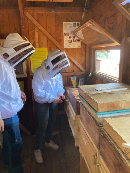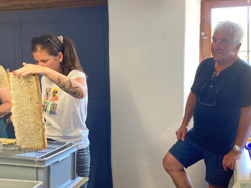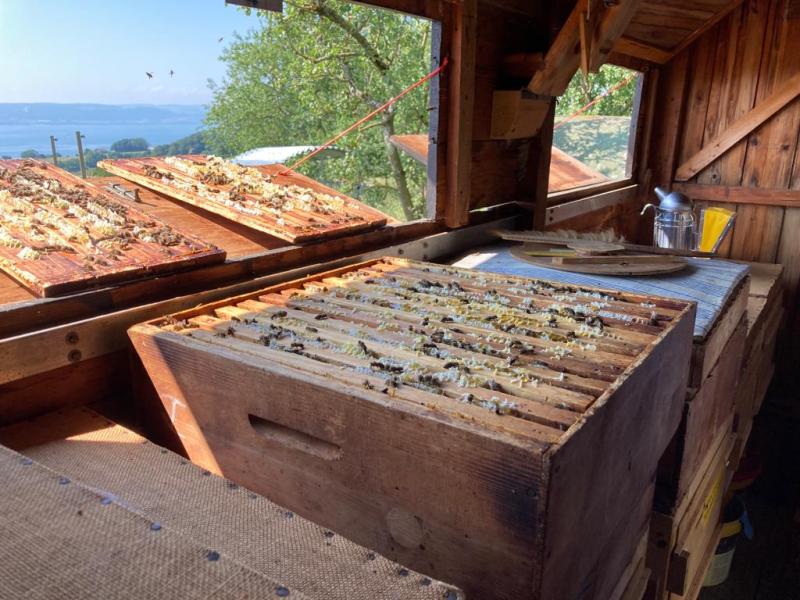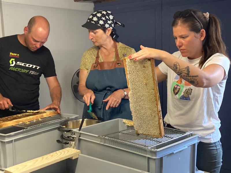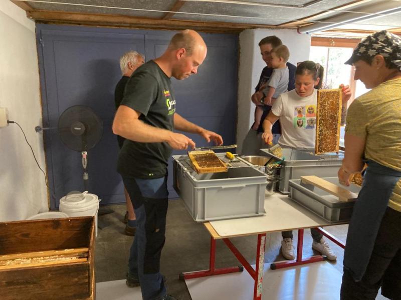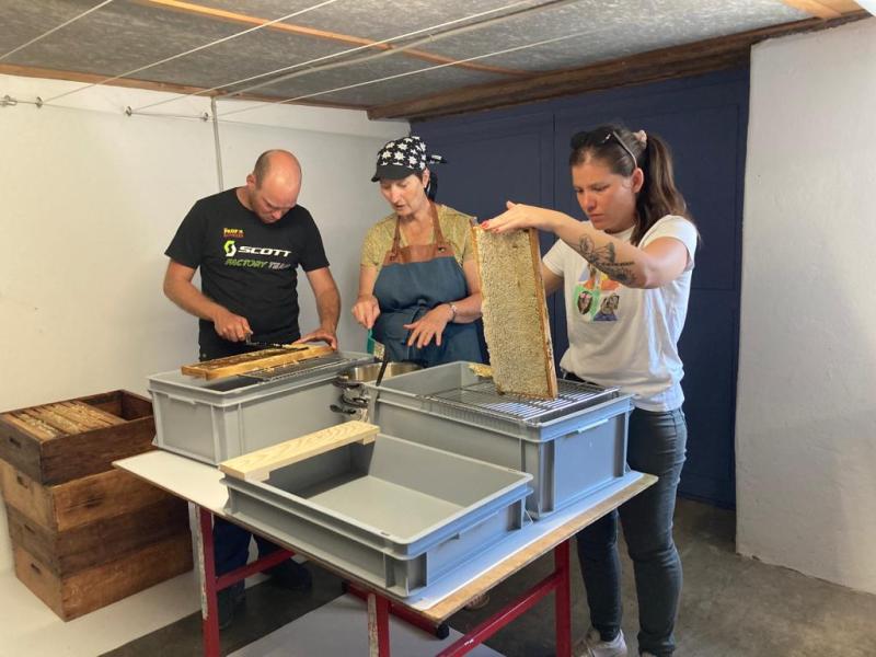 Le rendez-vous était donné le dimanche matin au rucher école pour preléver les cadres puis direction chez Catherine et Jean pour l'extraction.